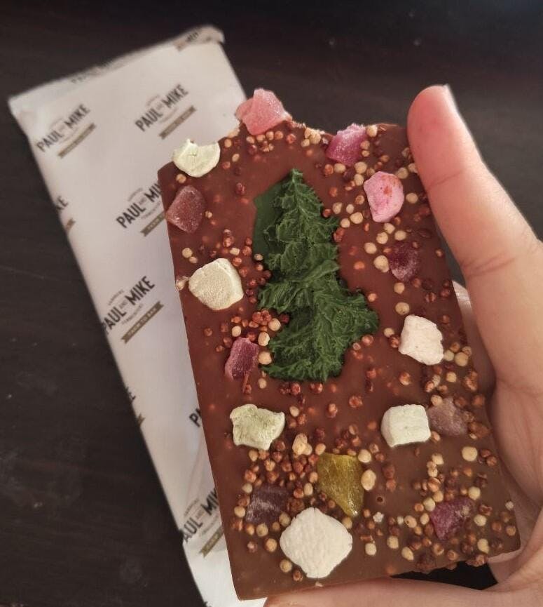 Reminiscent of holiday gatherings and childhood delights, this decadent tale of delight combines fluffy marshmallows, crispy crunchies, chewy gummies, crunchy candy cane, and an artfully molded white chocolate christmas tree (with natural color), all enveloped in luscious milk chocolate.