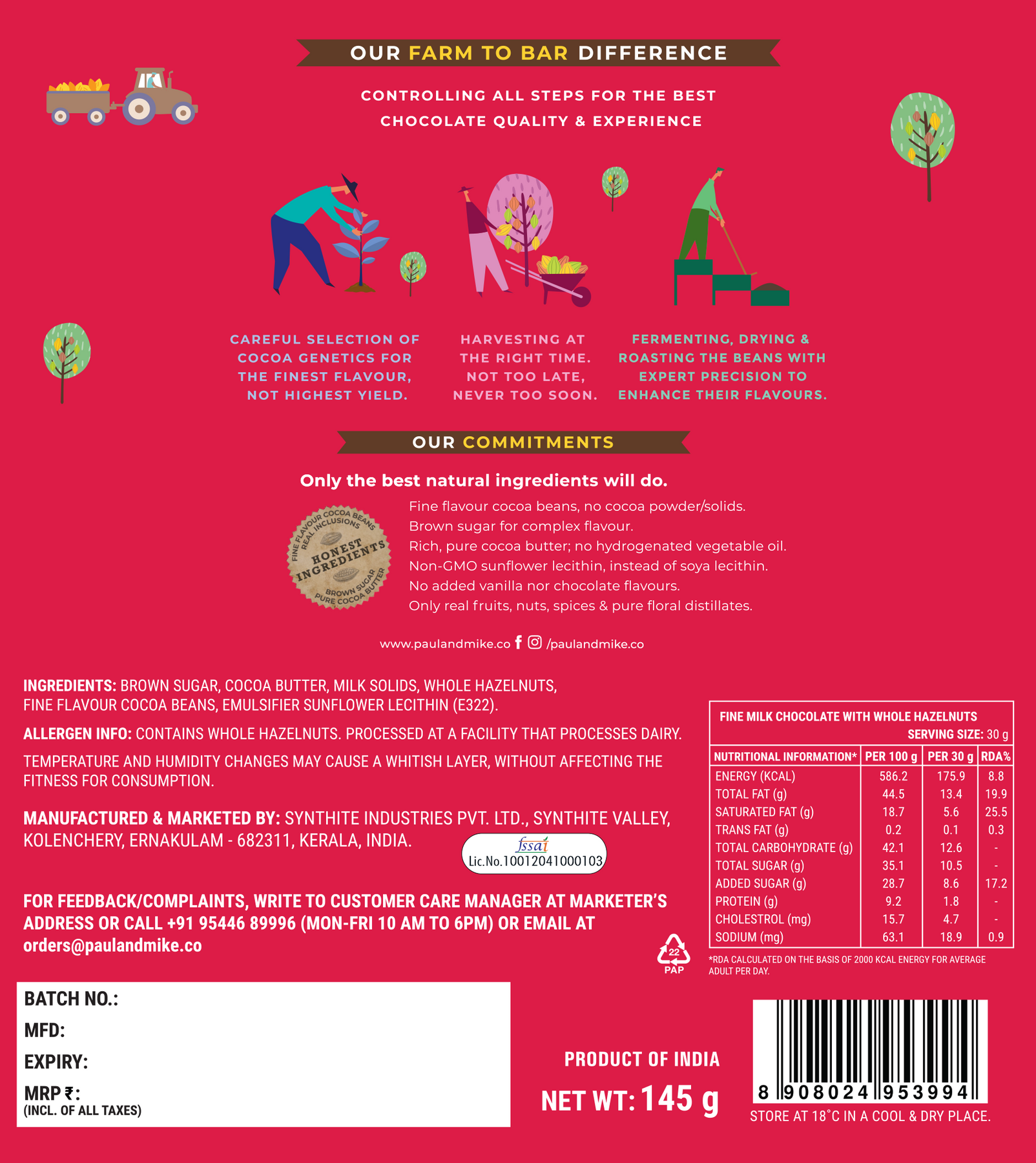 Brown Sugar, Cocoa Butter, Milk Solids, Hazelnuts, Fine Flavour Cocoa Beans, Emulsifier Sunflower Lecithin (E322).